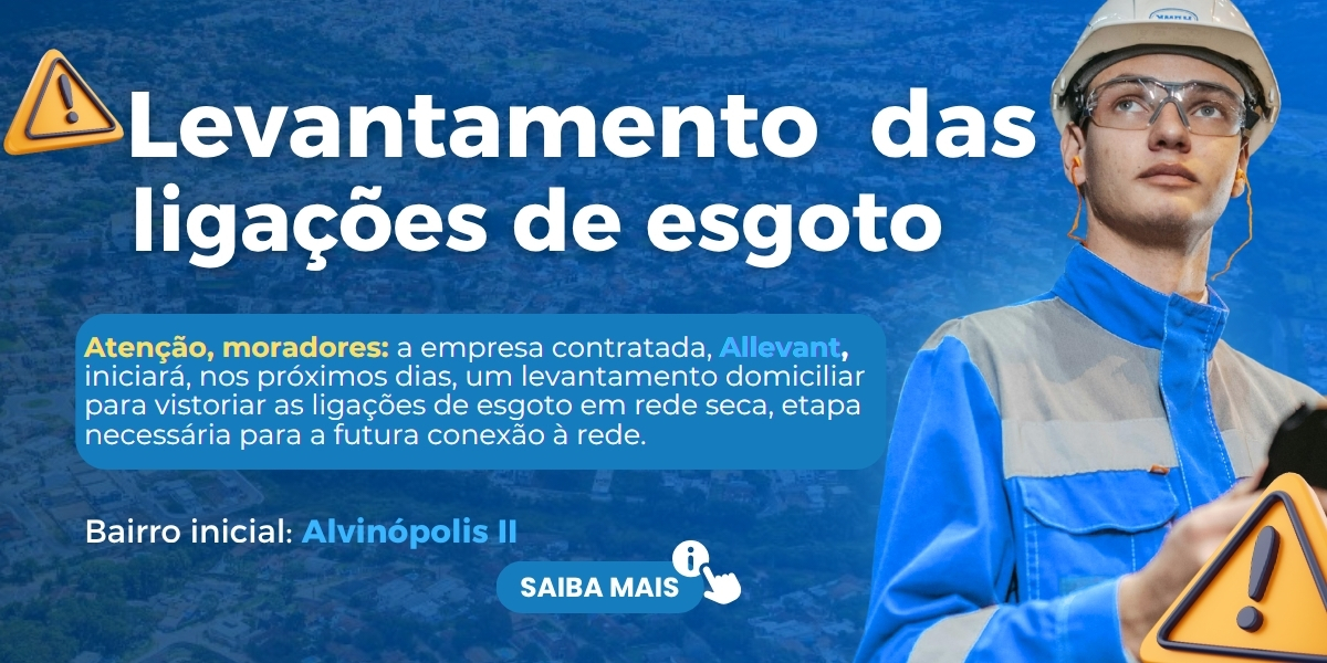 A SAAE Atibaia informa que, a partir de 10 de novembro de 2025 , as equipes da Allevant Engenharia e Consultoria, empresa contratada Atibaia Saneamento, a serviço da Saae, darão início ao levantamento em campo das ligações de esgoto , começando pelo bairro Alvinópolis II e, posteriormente, pelos bairros Jardim Cerejeiras e Jardim Imperial. Essas regiões são atendidas pelas Estações Elevatórias de Esgoto Onofre 3 e Onofre 4, e os serviços têm previsão de conclusão em julho de 2026.